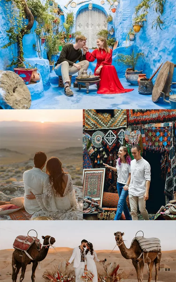 Hike to the Spanish Mosque for sunset. The short walk rewards you with panoramic views over the blue city and surrounding mountains. As the call to prayer echoes across the valley and the light turns golden, you’ll understand why couples return from Morocco transformed by its beauty.